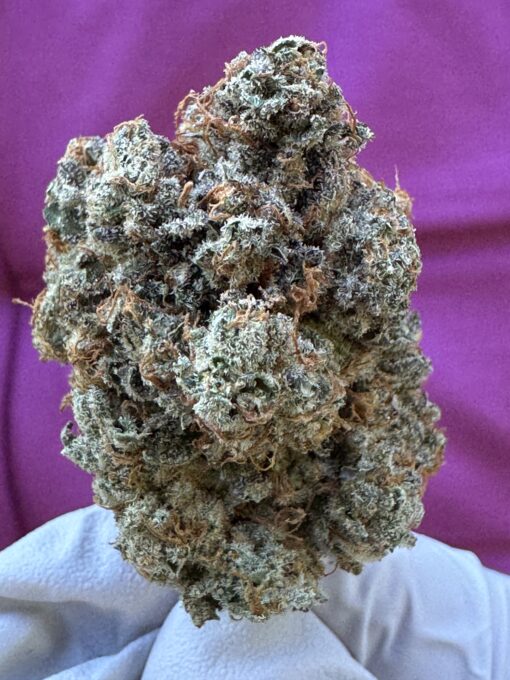 The buds themselves are striking. White Truffle’s influence shows up in the thick blanket of frosty resin and the occasional deep purple streaks, while Godfather OG brings the nose. Break one open and the nose hits immediately: a wave of diesel dankness that’s all gas and no brakes. The flavor follows suit, coating the tongue with rich fuel and peppery spice.